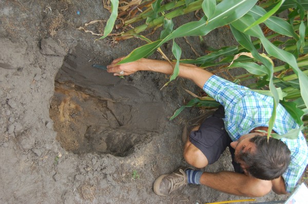 Wetenschapper Joachim Deru van het Louis Bolk Instituut beoordeelt de beworteling van de maïsplanten.